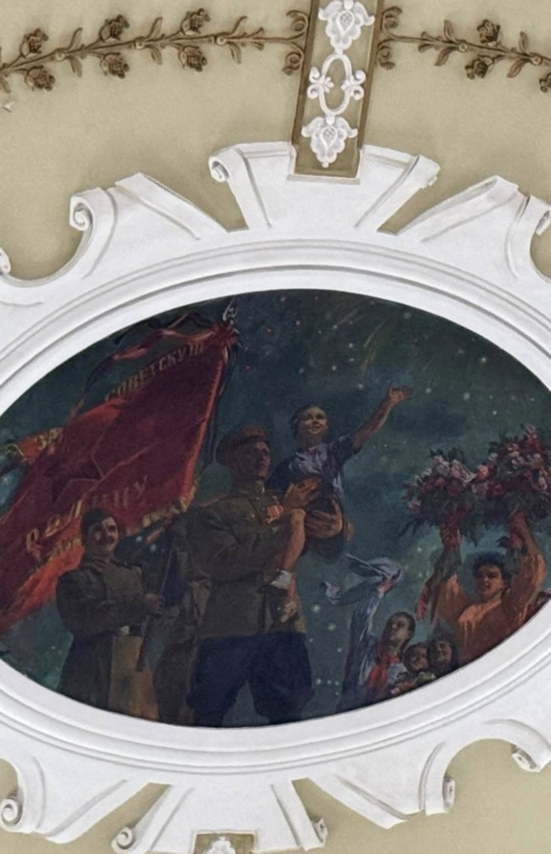 За інформацією активістів, на стелі залу залишився розпис із червоним прапором і написом "за совєтскую родіну". Саме під цими зображеннями проходять тисячі пасажирів щодня.