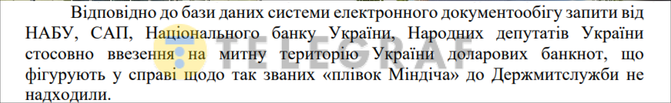 "Відповідно до бази даних системи електронного документообігу запити від НАБУ, САП, Національного банку України, народних депутатів України стосовно ввезення на митну територію України доларових банкнот, що фігурують у справі щодо так званих "плівок Міндіча", до Держмитслужби не надходили", — йдеться в ексклюзивній відповіді для "Телеграфу" від начальниці відділу пресслужби та взаємодії з громадськістю — офіційної прессекретарки Держмитслужби Алевтини Топчієвої.