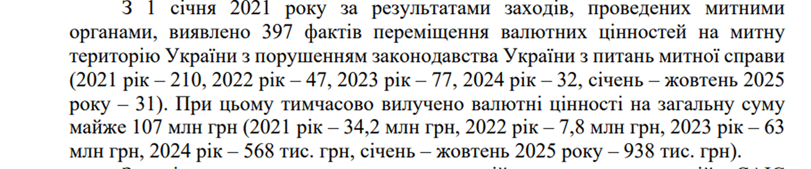 Водночас Топчієва запевнила, що Держмитслужба здійснює "заходи щодо запобігання та протидії незаконному переміщенню валютних цінностей через митний кордон України".