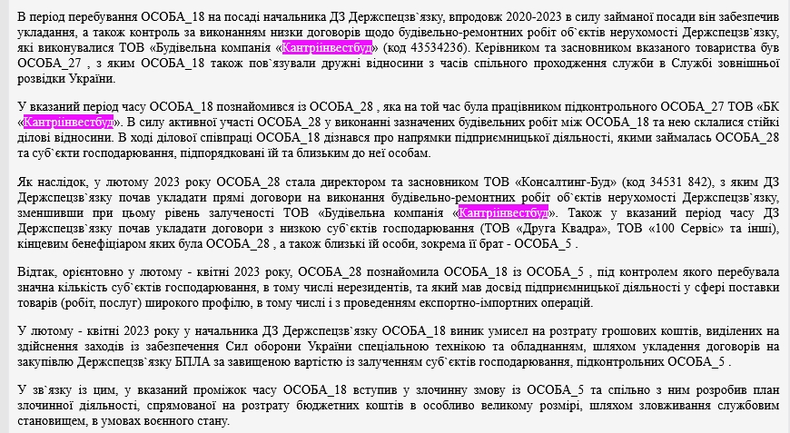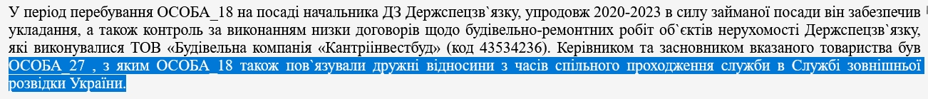 "У період перебування ОСОБА_18 на посаді начальника ДЗ Держспецзв`язку, упродовж 2020-2023 в силу займаної посади він забезпечив укладання, а також контроль за виконанням низки договорів щодо будівельно-ремонтних робіт об`єктів нерухомості Держспецзв`язку, які виконувалися ТОВ "Будівельна компанія "Кантріінвестбуд" (код 43534236). Керівником та засновником вказаного товариства був ОСОБА_27, з яким ОСОБА_18 також пов`язували дружні відносини з часів спільного проходження служби в Службі зовнішньої розвідки України", — йдеться, зокрема, у матеріалах судової справи.