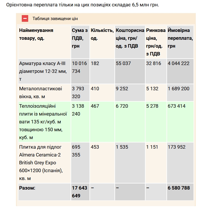 "Наші гроші", які розбирали кошторис від "Кантріінвестбуду" вже знайшли завищення ціни лише за деякими позиціями на понад 6,5 млн грн.