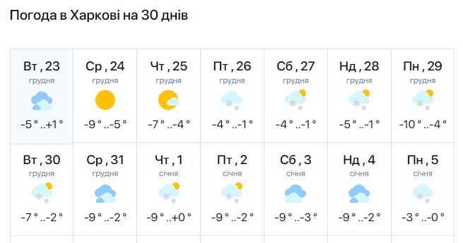 Аналогічної думки дотримуються фахівці сервісу meteo.ua. За їх прогнозом з 26 грудня по 2 січня в Харкові може пройти сніг. При цьому цей сервіс очікує більш відчутне похолодання — аж до -9 градусів.