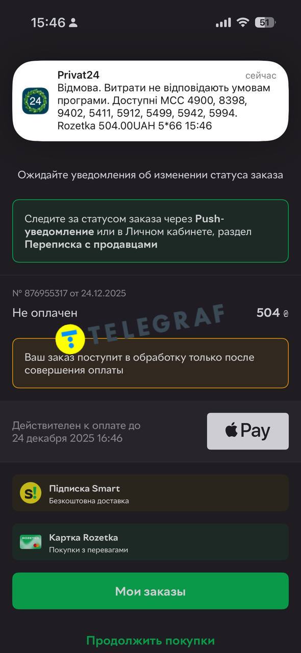 Однак, оплата не пройшла. Банк відхилив транзакцію через "не відповідність умовам" програми.