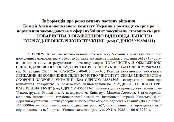 "Комісія постановила зобов'язати ДЕРЖАВНЕ НЕКОМЕРЦІЙНЕ ПІДПРИЄМСТВО "ІНСТИТУТ СЕРЦЯ МІНІСТЕРСТВА ОХОРОНИ ЗДОРОВ'Я УКРАЇНИ" (Код ЄДРПОУ: 38831595) скасувати рішення про визначення товариства з обмеженою відповідальністю "БУДІВЕЛЬНА ІНДУСТРІЯ КАНТРІІНВЕСТБУД" (код ЄДРПОУ:43534236) переможцем за процедурою закупівлі", — йдеться, зокрема, у відповідному рішенні АМКУ.