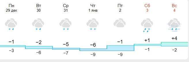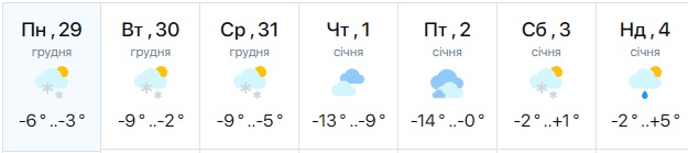 Схожої думки дотримуються і спеціалісти сервісу meteo.ua. За їхнім прогнозом, стовпчики термометрів також опускатимуться з 30 грудня. Однак цей сайт прогнозує значно серйозніші морози — до -13. Пік холодів настане 1 січня. Можливі опади у вигляді снігу.