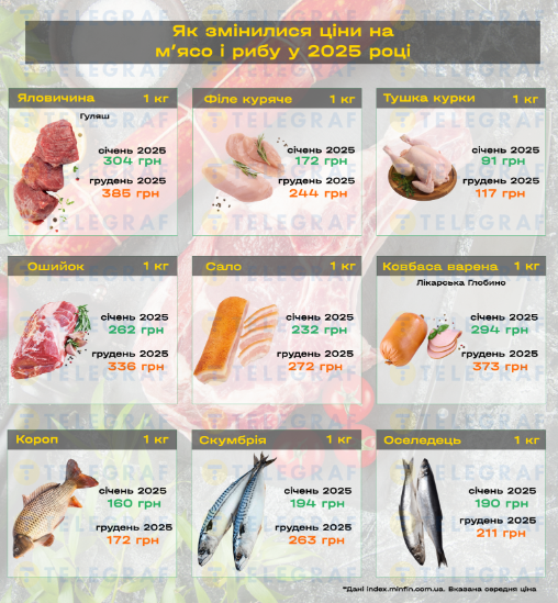 Ковбаски – 690 гривень за кілограм (13,9 євро). Фарш – 788 гривень (15,9 євро). Свинина — 1285 (25,9 євро). Телятина – 1433 гривні (28,9 євро).