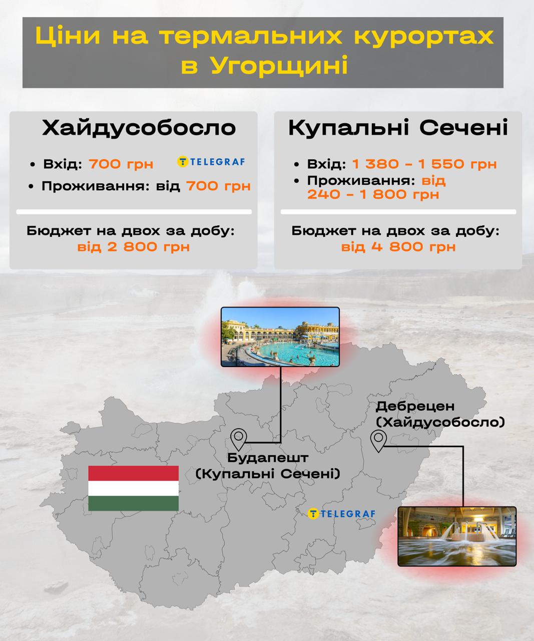 Купальня Сечені в Будапешті – найбільший термальний комплекс Європи – значно дорожча. У будні квиток із шафкою коштує 12500 форинтів (близько 1380 гривень), проте на цілий день, у вихідні – 14000 форинтів (1550 гривень).