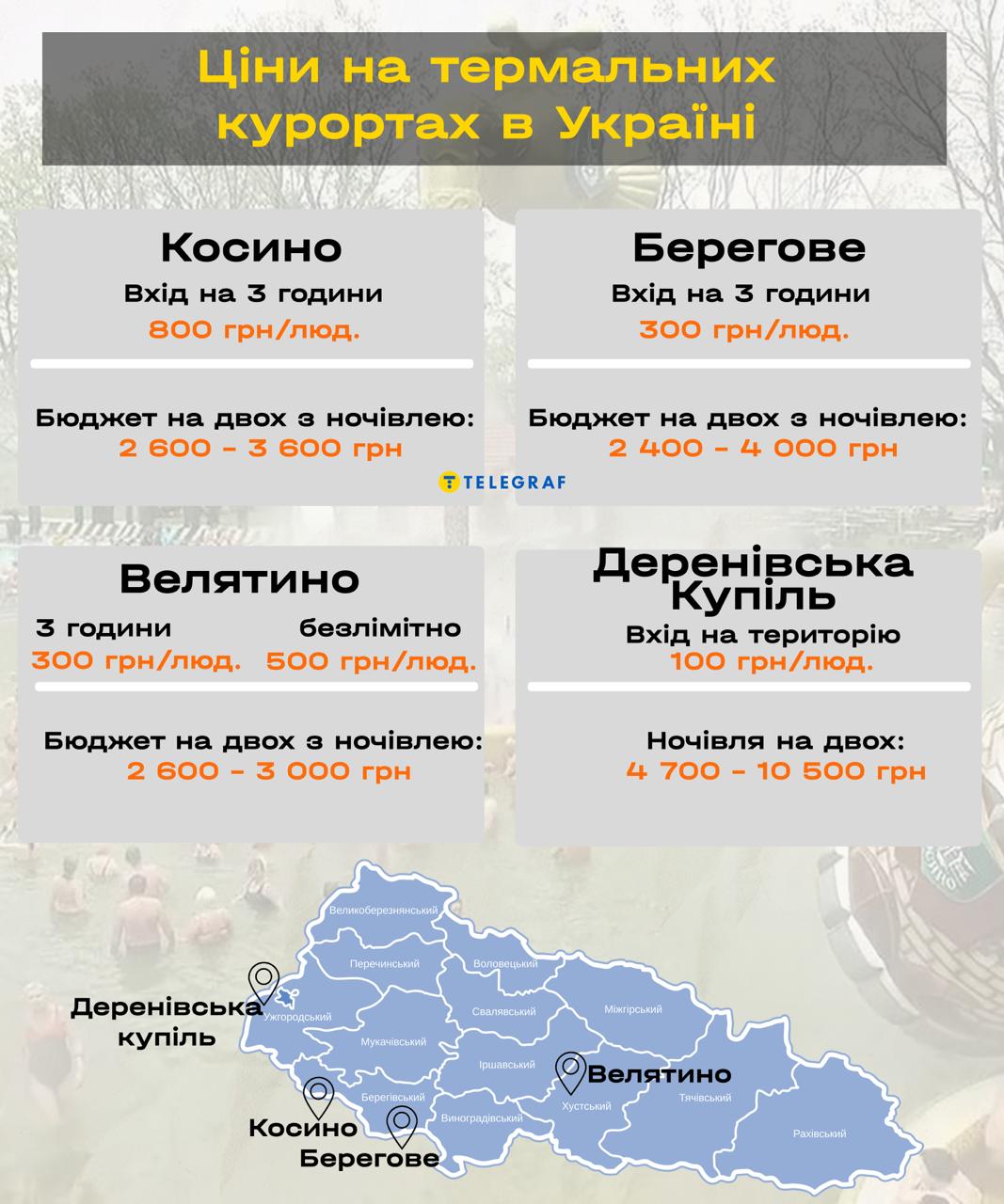 Україна має потужну базу термальних вод, особливо в Закарпатській області. У найпопулярніших локаціях – Косино, Берегове, Велятино та Деренівська Купіль – можна організувати відпочинок за цінами, які об'єктивно нижчі за європейські.