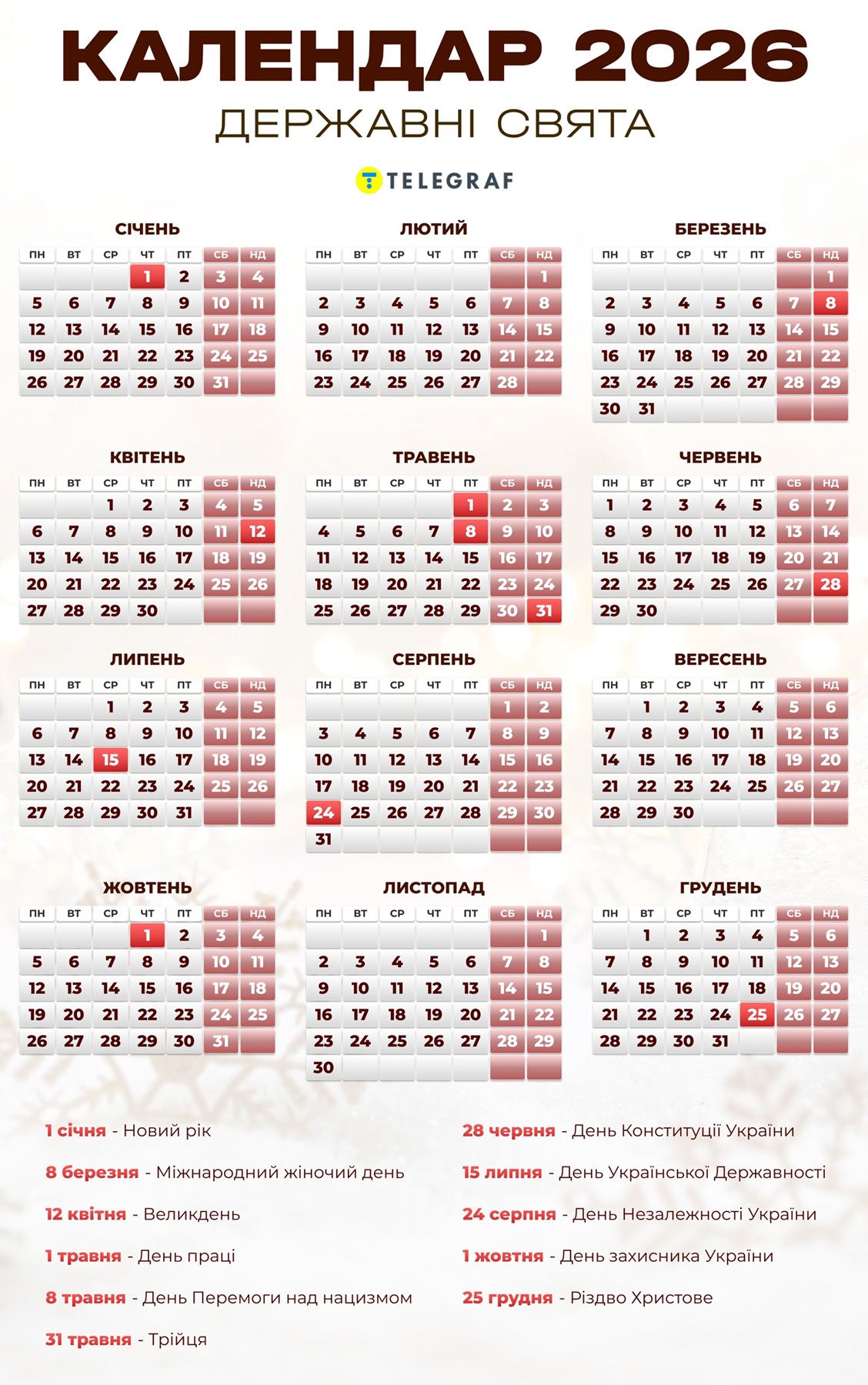 "Телеграф" підготував повний календар на 2026 рік з усіма вихідними та святами, які чекають на українців.