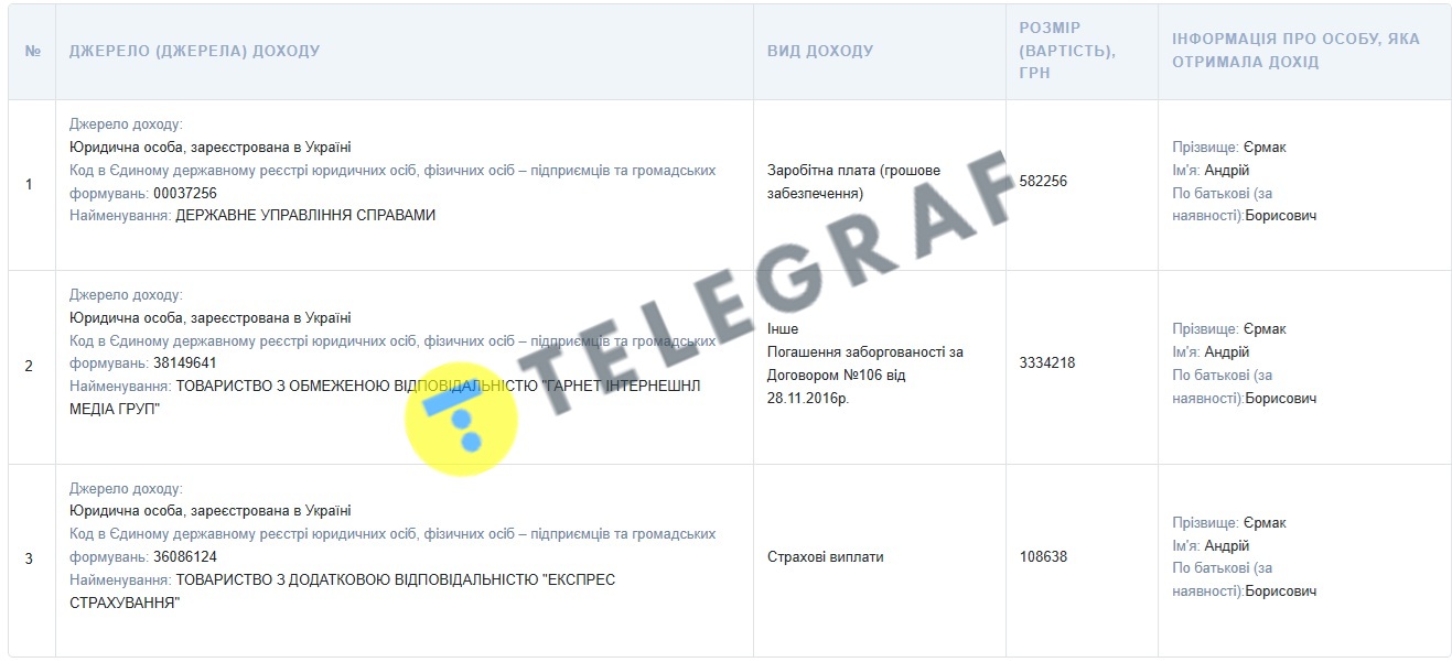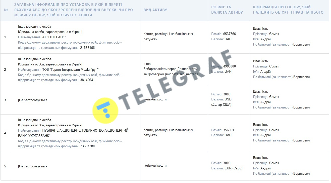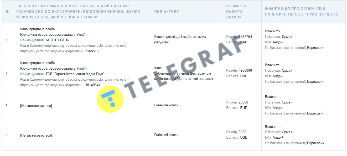 Також Єрмак отримав ще майже півмільйона гривень від відсотків депозитів у банку.