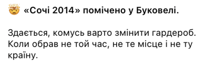 - "Сочі 2014" помічено у Буковелі. Здається, комусь варто змінити гардероб. Коли обрав не той час, не те місце і не ту країну.