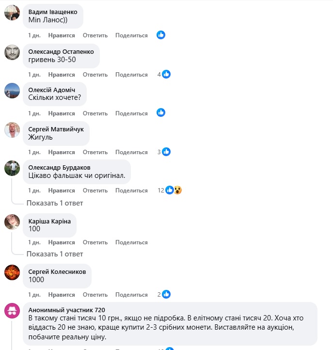 Коментатори під постом також високо оцінили вартість монети, а дехто навіть іронічно запропонував її обміняти на автомобіль "Ланос" або "Жигулі". Справді, на сайтах продажу авто вартість, наприклад, "Ланоса" стартує від 30 тисяч гривень, що збігається з вартістю монети.