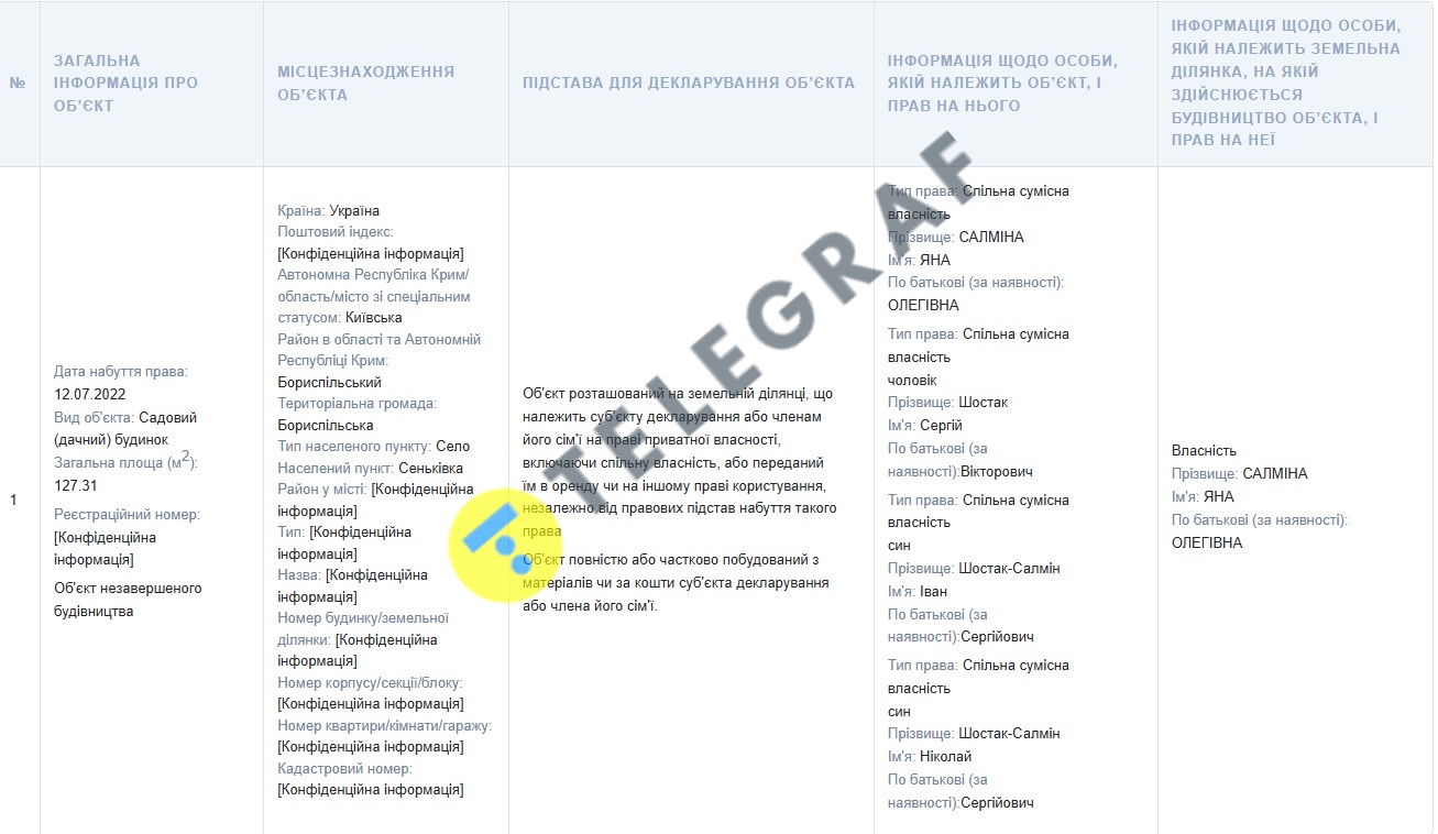 До речі, незважаючи на те, що єдина нерухомість, яку Салміна вказує у декларації – недобудова під Києвом, на роботу вона їздить, як з’ясували журналісти, з іншої адреси. Йдеться про квартиру у столиці. Правом власності на цю квартиру, згідно з даними реєстру нерухомості, з 2014 року незмінно володіє Олег Салмін – батько держслужбовця, громадянин Росії та працівник російського військово-промислового комплексу.
