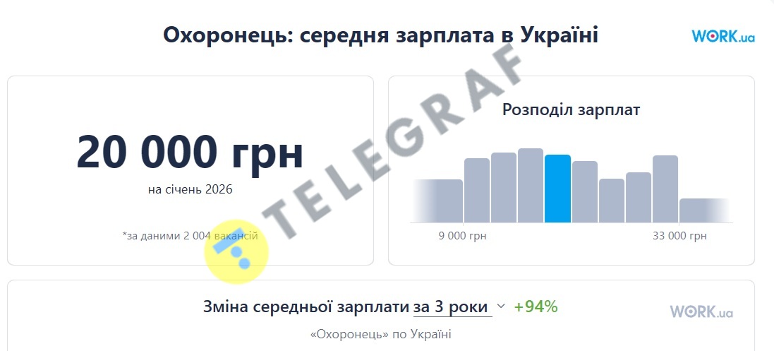 Згідно з інформацією сайту, зараз (січень 2026 р.) середня заробітна плата охоронця в Україні становить приблизно 20 тисяч гривень. Це на 94 відсотки більше, ніж у 2023 році, коли в середньому за таку працю платили 10 300 гривень.