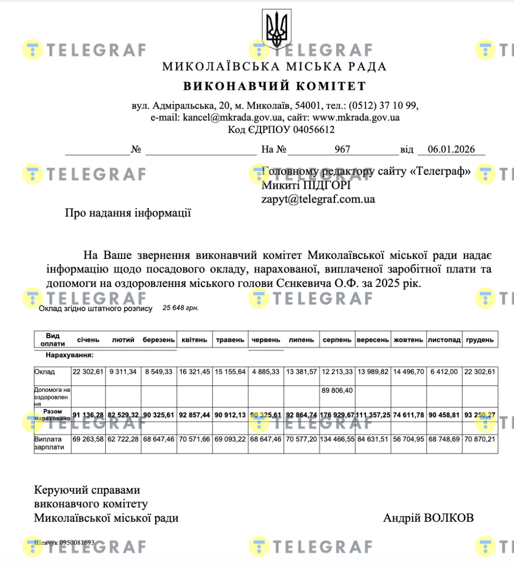 Про це повідомили в Миколаєвській міській раді у відповідь на запит "Телеграфу". Зазначивши, що матеріальна допомога на оздоровлення Сєнкевичу нараховувалась у серпні 2025 року.