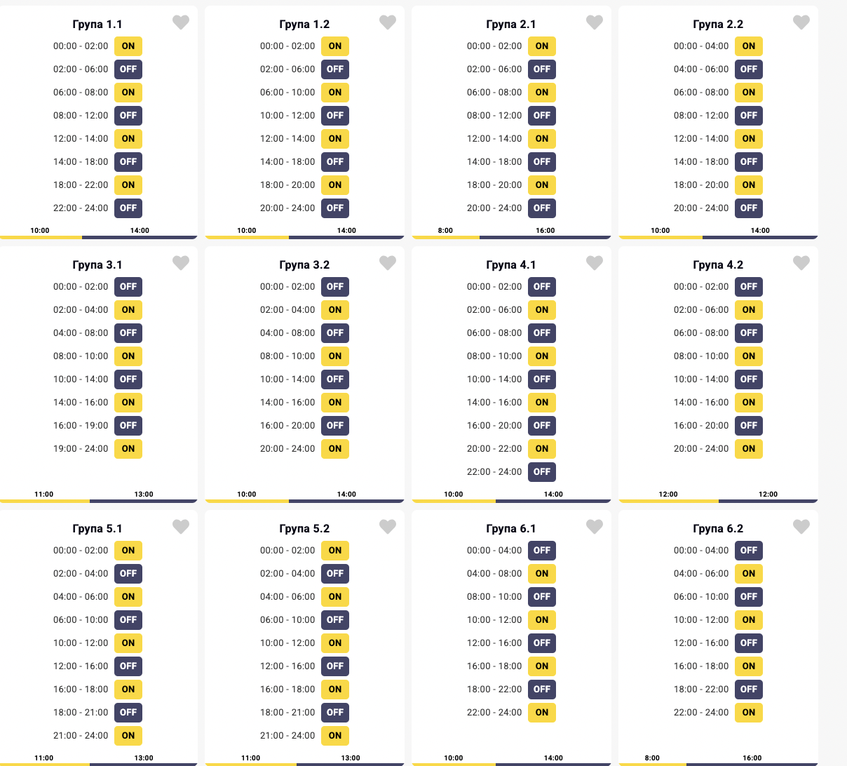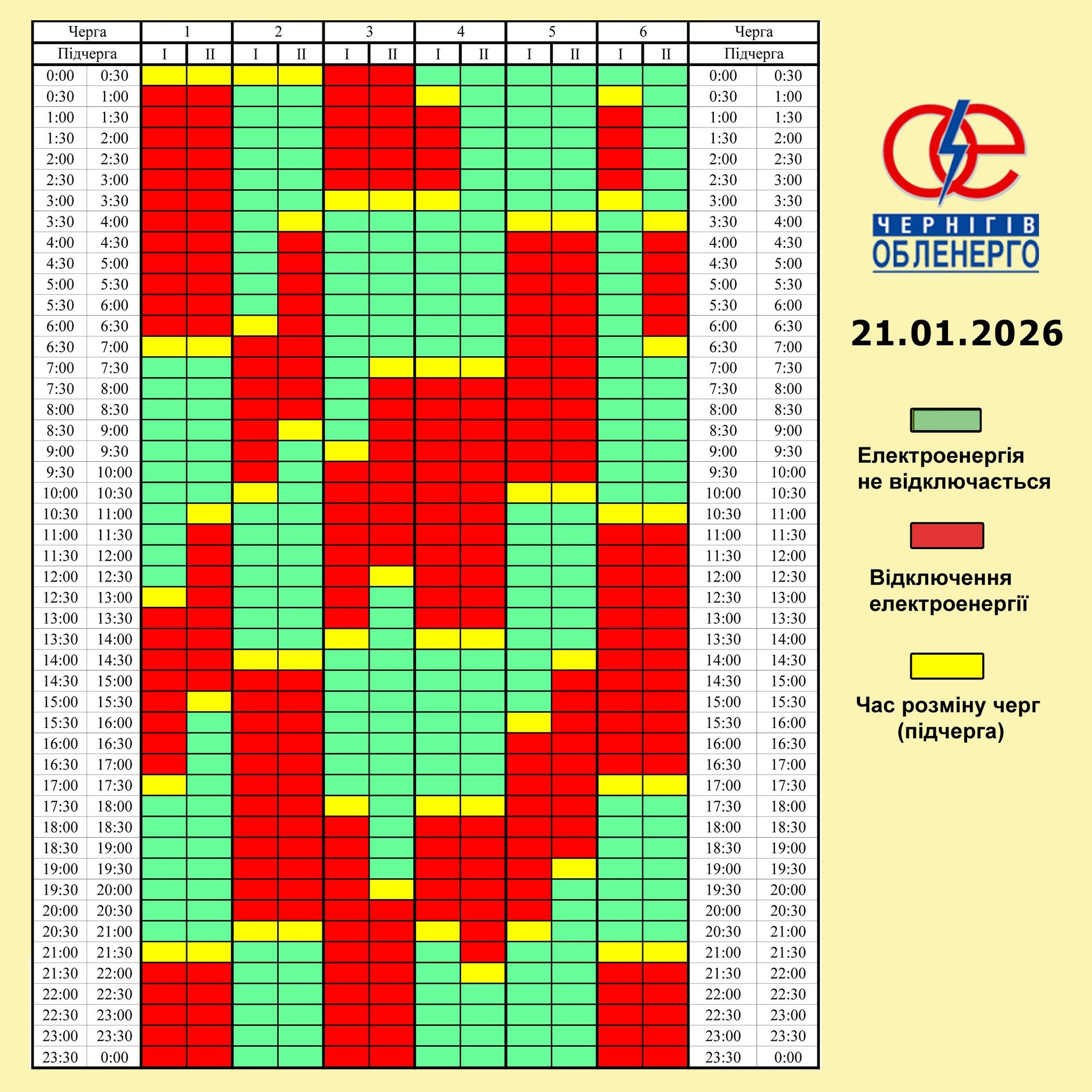Діють екстрені відключення. Енергетики працюють без перерв 24/7, щоб забезпечити киян світлом з орієнтовною періодичністю: близько 3 годин зі світлом та 10 годин без. Однак ситуація не рівномірна і може змінюватись протягом дня. Дати точний графік поки що неможливо.