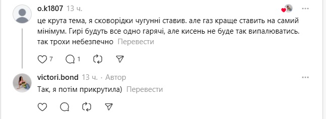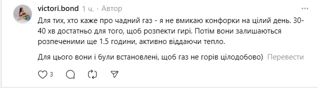 У коментарях користувачі підтвердили, що лайфхак дівчини працює. Однак деякі радять робити таке на малому газі через пожежну небезпеку і у великих кімнатах через малу ефективність (оскільки у гир малі площі поверхонь). Також коментатори не радять залишати газ надовго через чадний газ.
