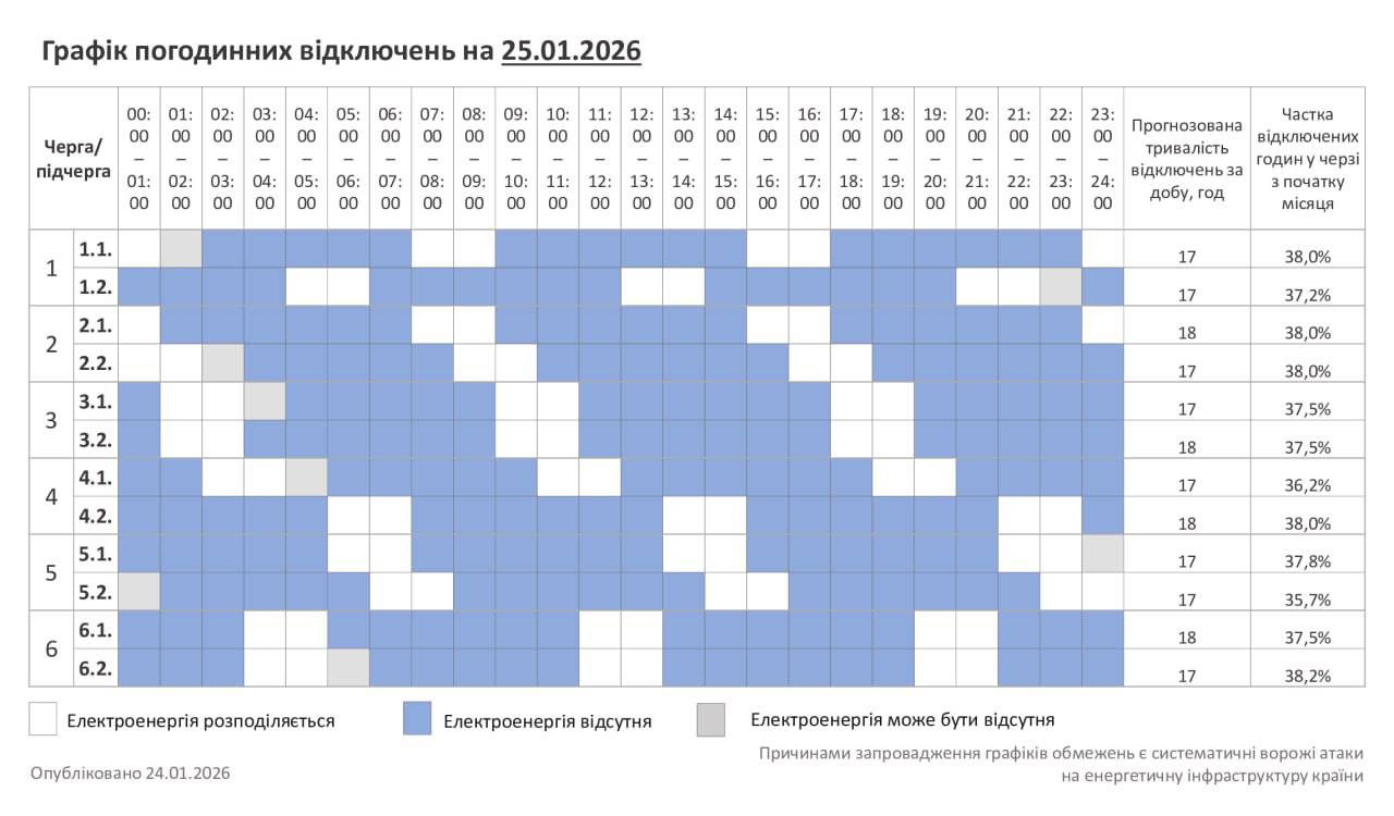 Через енергетичний терор Росії українці змушені жити в умовах постійних відключень світла. Тож у неділю, 25 січня, протягом усього дня в країні будуть відключення електрики для побутових споживачів, повідомляє "Укренерго"