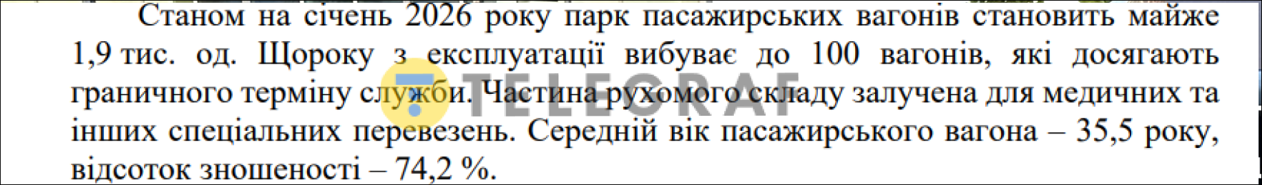 Середній вік одного пасажирського вагона становить 35,5 року. Загальний рівень зношеності парку оцінюється у 74,2%, що означає, що значна частина вагонів фактично перевищила або наближається до перевищення нормативного строку експлуатації.