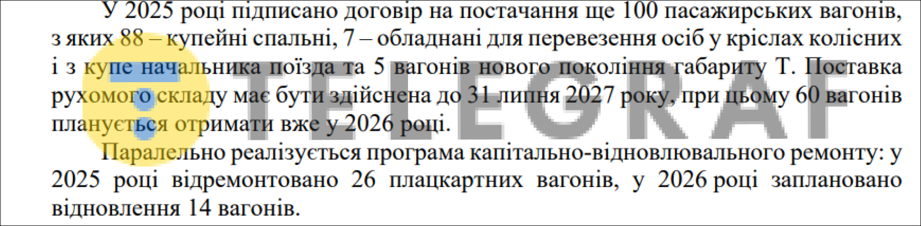 Паралельно з новими закупівлями реалізується програма капітально-відновлювального ремонту. У 2025 році було відремонтовано 26 плацкартних вагонів, а у 2026 році заплановано відновлення ще 14 одиниць рухомого складу.