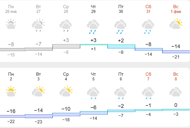Про це повідомляють синоптики у своїх прогнозах погоди. Так, наприклад, фахівці сайту Meteofor вважають, що з 31 січня до 5 лютого до обласного центру прийдуть морози. У цей час стовпчики термометрів сильно опустяться і триматимуться на рівні -8-23 градуси. У деякі дні можливий сніг.
