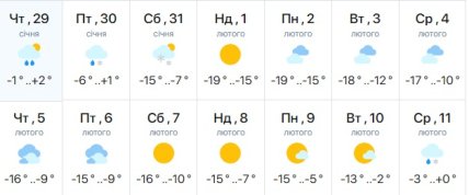 Аналогічної думки дотримується метеорологічний сервіс Meteo.ua. Там також прогнозують похолодання, яке розпочнеться 31 січня. Однак у ці фахівці вважають, що воно триватиме довше — до 10 лютого. У цей час температура повітря опуститься до -5-19 градусів. 31 січня можливий сніг.