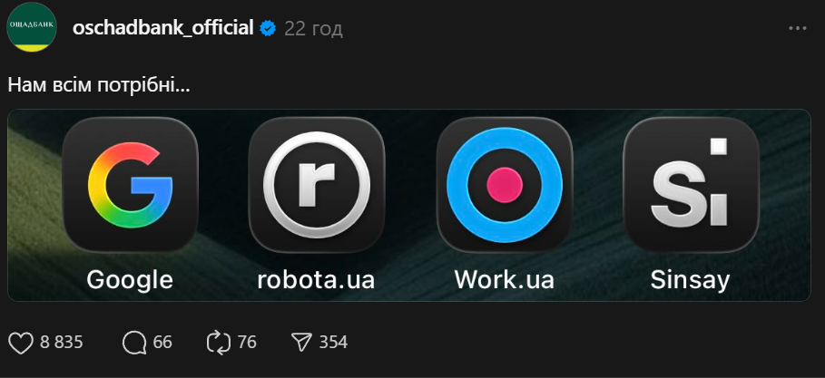 Приєднався до тренду і "Ощадбанк", створивши з іконок слово "Гросі (гроші)" — Перед тим, додавши "Нам усім потрібні…".