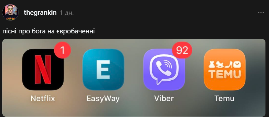 Використовуючи іконки "Netfliх", "EasyWay", "Viber" та "Temu", користувач склав "Не в тему".