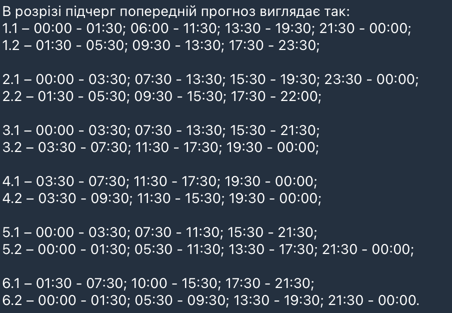 - Графіки будуть нерівномірні в різних районах через особливість пошкоджень енергосистеми.