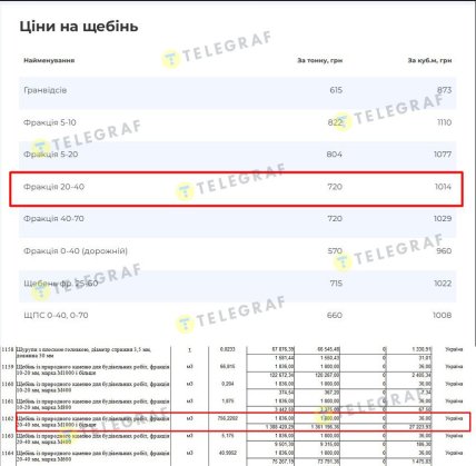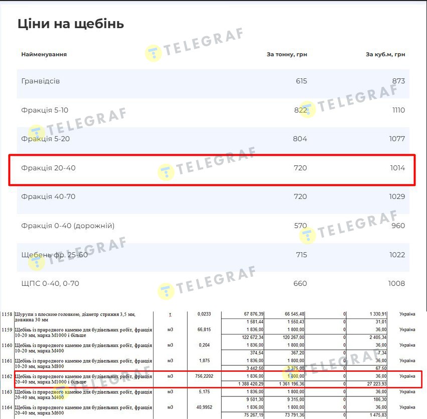 - відпускна ціна щебню із природного каменю для будівельних робіт, фракція 20-40 мм, марка М1000 і більше – 1800 грн/куб м (разом із заготівельно-складськими витратами – 1836 грн/т). Це вище за орієнтовну ринкову ціну у 1014 грн/куб. м., при якій на цій позиції витрати будуть більшими на 594,3 тис. грн.