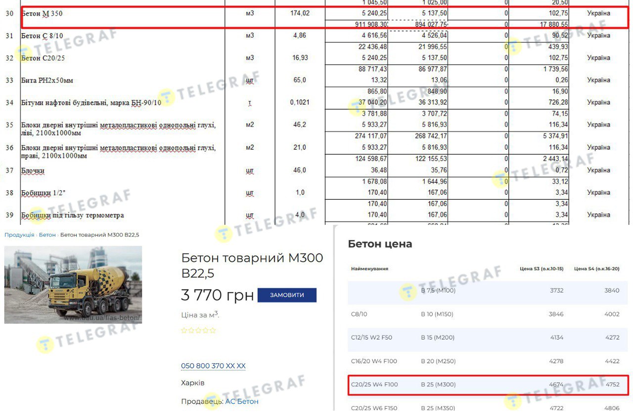 - відпускна ціна на бетон М350, який використовується при заливанні монолитних фундаментів, – 5137 грн/куб м (разом із заготівельно-складськими витратами – 5240, 25 грн/куб м). Натомість ринкові ціни на цей матеріал у Харкові від 3770 до 4800 грн/куб м. З урахуванням заявленої кількості – 174 куб. м зекономити можна було мінімум 58,7 тис. грн., максимум – 237,9 тис. грн.