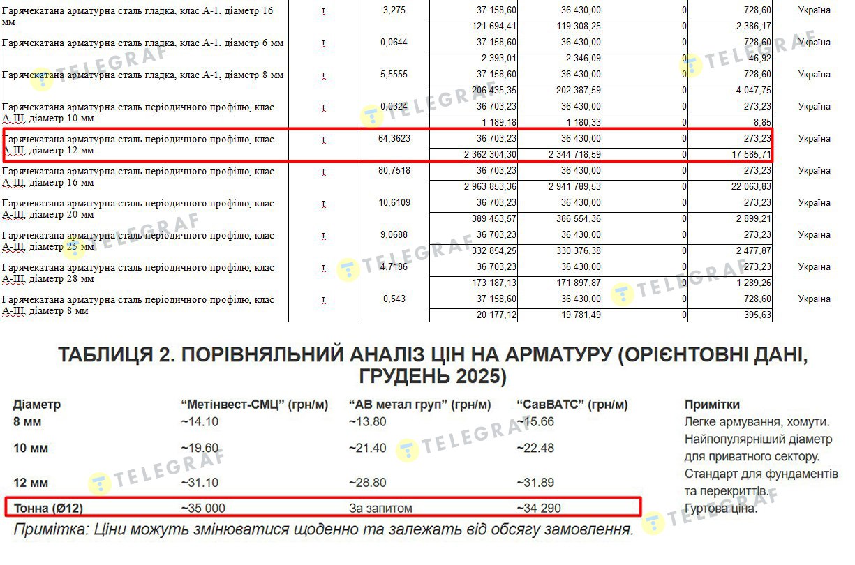 - відпускна ціна на гарячекатану арматурну сталь періодичного профілю, клас А-ІІІ, діаметр 12 мм – 36,4 тис/т (разом із заготівельно-складськими витратами – 36,7 тис/т). Пропозиція вище за середню на ринку, наприклад, "Метінвест-СМЦ" станом на кінець 2025 року пропонував цей матеріал за 35 тис./т, а "СавВАТС" – 34,2 тис/т. При планах закупити 64,3 т економія у разі обрання більш дешевих варіантів могла б становити 109,4-160,9 тис. грн.