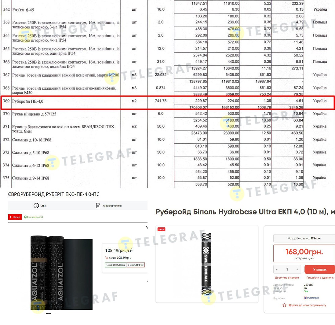 - відпускна ціна руберойда ПЕ‑4,0 – 224 грн /кв м (з доставкою і складськими витратами — 229,87 грн/ кв м) – помітно вища за середній ринковий рівень для такого матеріалу. Для порівняння — ціна на руберойд Аквазіол коливається від 108 до 130 грн/кв м, а інші марки продають за 168 грн/кв м. Який саме матеріал використає "Трест Житлобуд-1" на об'єкті наразі невідомо, тож важко і визначити, наскільки можна було зекономити.