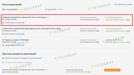 Ще один топовий тендер з початковою ціною 212 млн грн. стосується будівництва протирадіаційного укриття для Харківського ліцею №24 ім. Питікова. В цьому випадку переможцем було визнано єдиного учасника – ПП "Будівельна фірма "Промтех". Попри відсутність конкуренції компанія запропонувала виконати роботи на 14,4 млн грн дешевше, тобто за 197,7 млн грн.