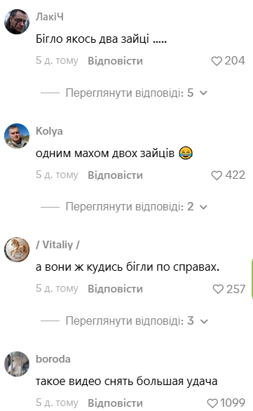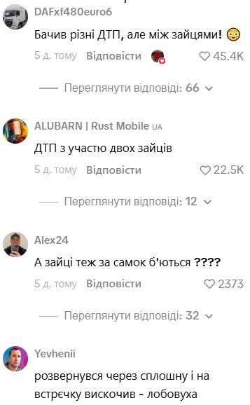 У коментарях під роликом з’явилися тисячі кумедних коментарів. Люди жартують, що на засніженій дорозі сталася справжня ДТП за участю двох зайців. При цьому багато хто захоплений унікальним кадром, який вдалося зняти автору.