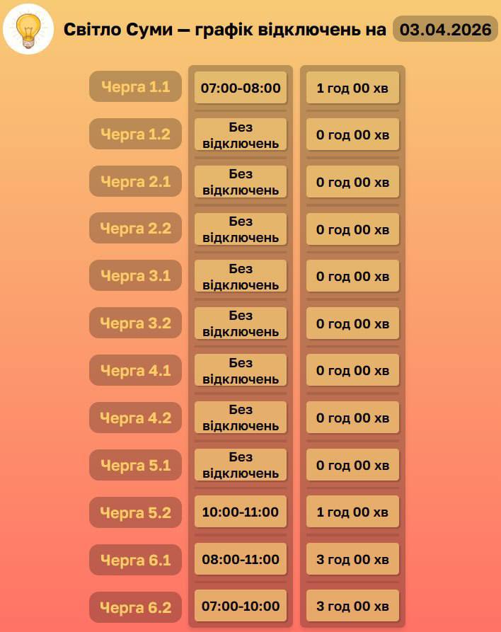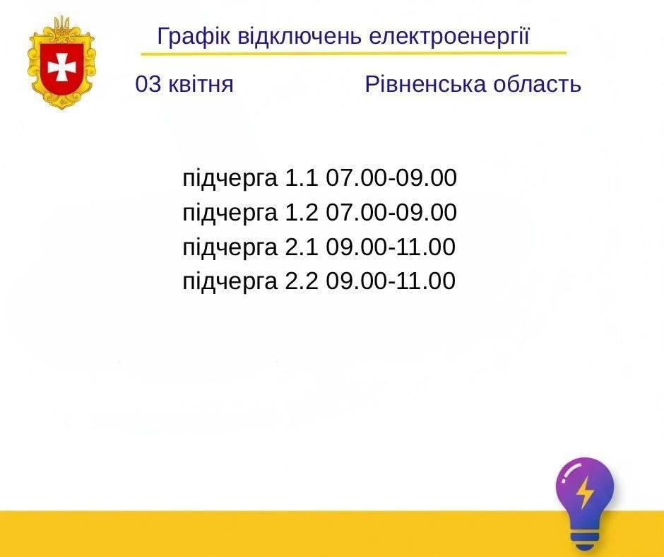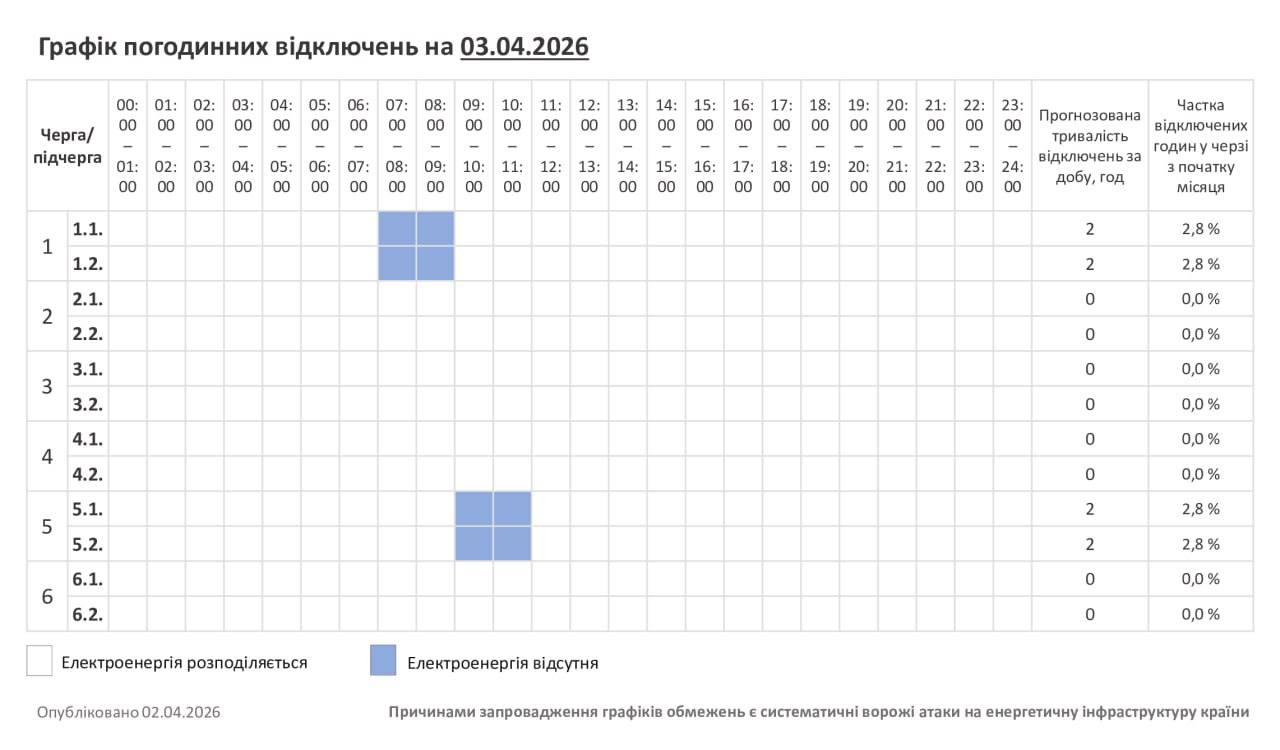 Через енергетичний терор Росії українці змушені жити в умовах постійних відключень світла. У п'ятницю, 3 квітня, у всіх областях України з 07.00 до 11.00 будуть відключення електрики для побутових споживачів, повідомляє "Укренерго".