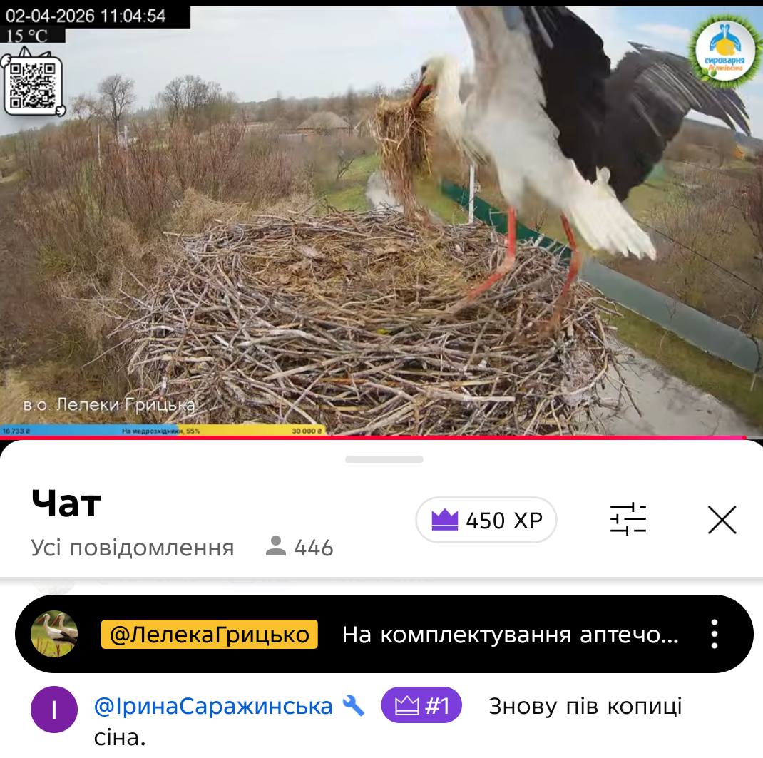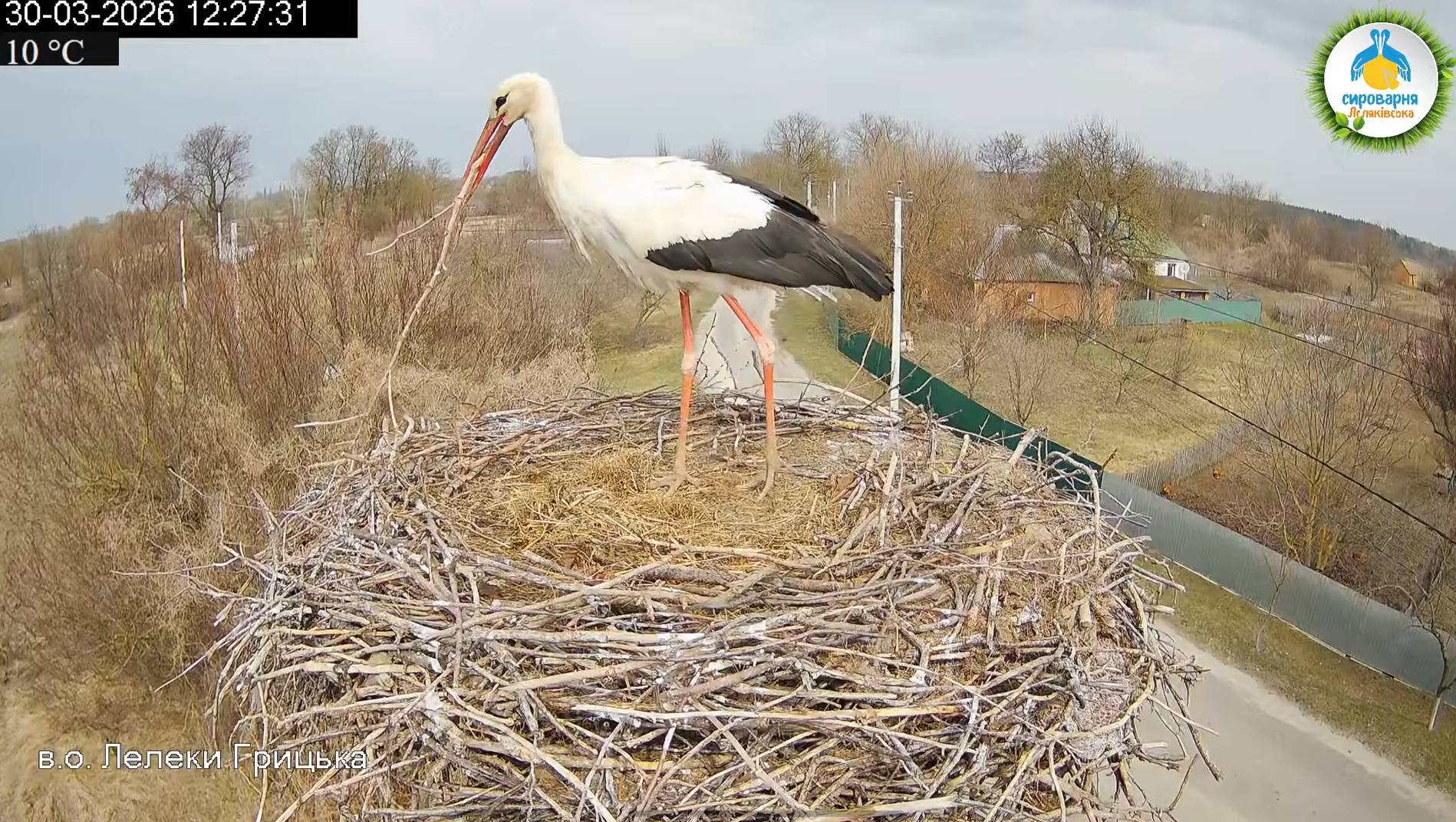 Камера зафіксувала, що "умовний Грицик" 30 березня аж 14 разів приносив до гнізда будівельні матеріали — гілки, листя й сіно.