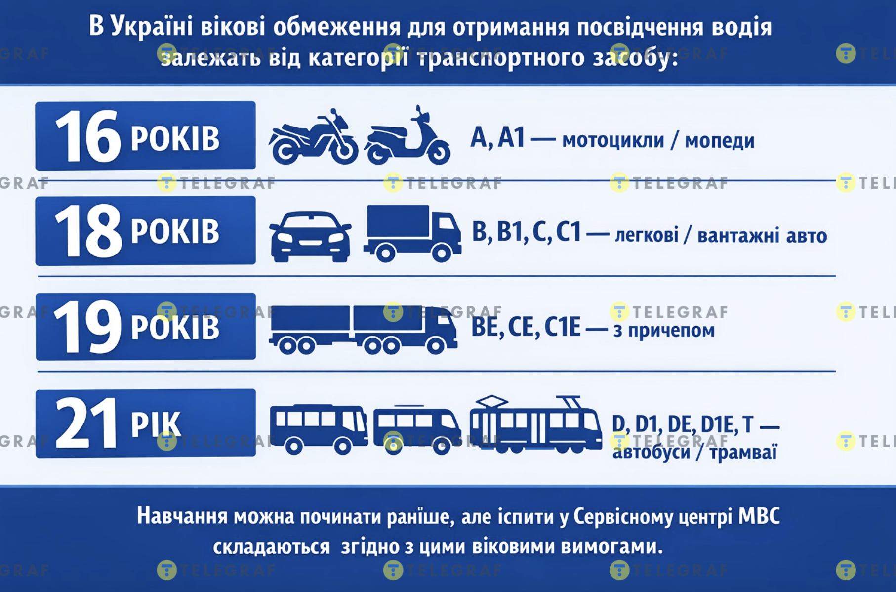 Так, водії мопедів і мотоциклів можуть отримати права з 16 років, для легкових авто і вантажівок — з 18 років, для машин з причепом і автопоїздів — з 19 років, а для автобусів — з 21 року. Отримати водійське посвідчення можна, склавши теоретичний та практичний іспити в сервісних центрах МВС.