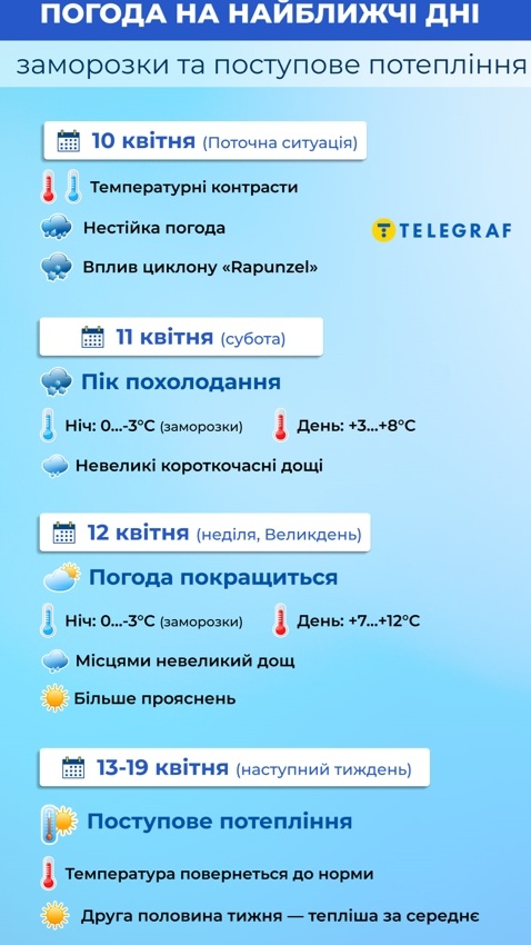 Раніше начальник Черкаського обласного гідрометцентру Віталій Постригань у коментарі "Телеграфу" розповідав про те, що над Україною зараз домінує глибокий висотний циклон — його верхня межа сягає 16 км, виходячи до нижньої стратосфери. Він формує ядро холоду в тропосфері та підтримує циклон "Rapunzel", що несе опади та знижений температурний режим.