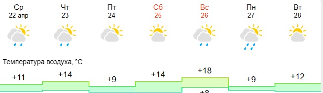 За даними сервісу, потепління у Дніпрі буде поступовим та нерівномірним через активність циклонів. Вже в неділю, 26 квітня, очікується різкий стрибок температури до +17 градусів (це на 6-8 градусів вище, ніж у попередні дні тижня). Це потепління не буде сонячним. Воно обумовлене приходом теплого, але вологого фронту. Разом із піком температури прийдуть найсильніші опади за весь період (ймовірність 65%).