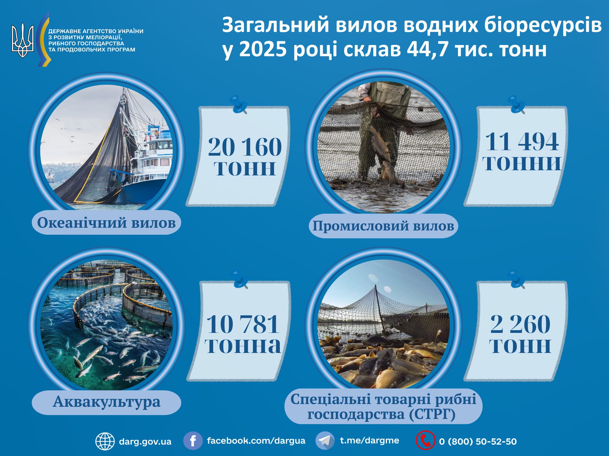 За даними Державного агентства меліорації та рибного господарства України, за 2025 році загальний обсяг вилову риби та інших водних біоресурсів підприємствами рибної галузі України становив 44,7 тис. тонн. Та більшість цієї риби виловили за межами країни – 20 160 тонн. Зокрема, це Антарктика та Атлантичний океан.
