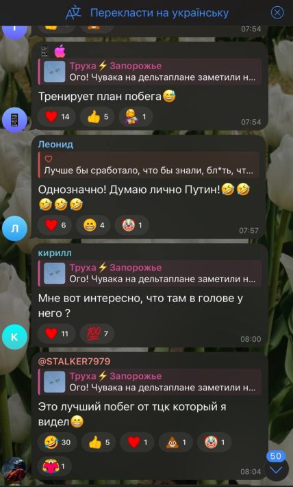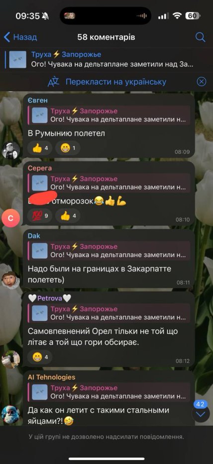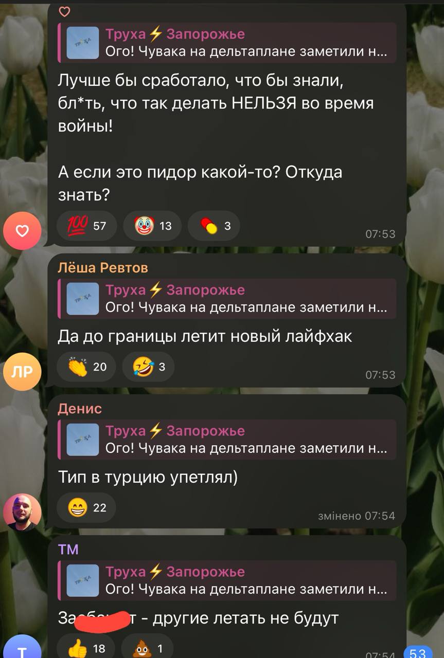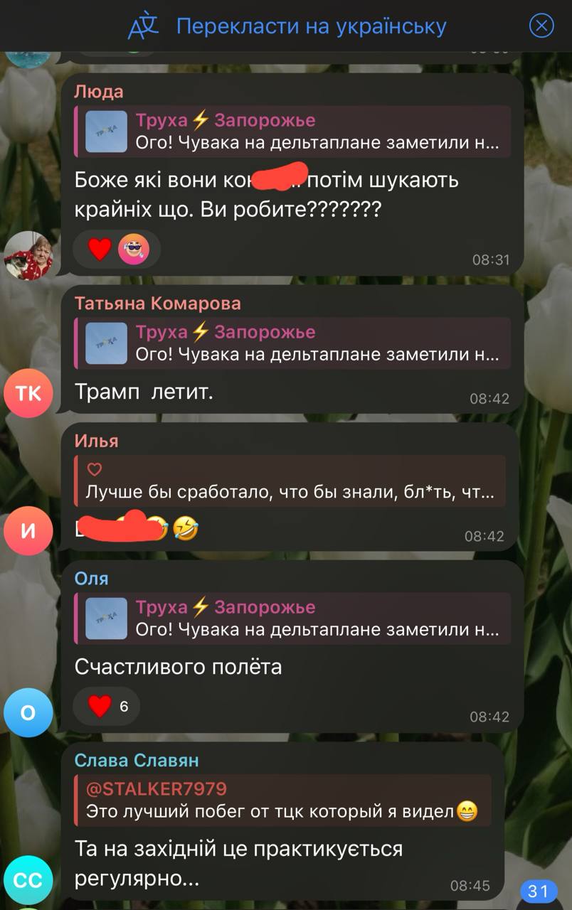 "Чувак на дельтаплані був помічений над Запоріжжям. Головне, щоб протиповітряна оборона не працювала", — йдеться у повідомленні.