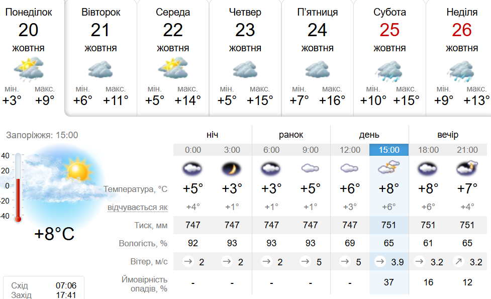 Зазначимо, що згідно з прогнозом погоди, у понеділок, 20 жовтня, у Запоріжжі вдень температура повітря на рівні всього +8 градусів. При цьому вранці було від +3 до +5 градусів. А надвечір очікується до +7 градусів.