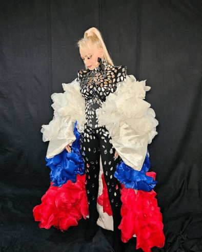 Образ Доліної створив російський дизайнер Джемал Махмудов. Комбінезон жінки виблискував, а за собою 68-річна зрадниця тягнула триколор у вигляді воланів.