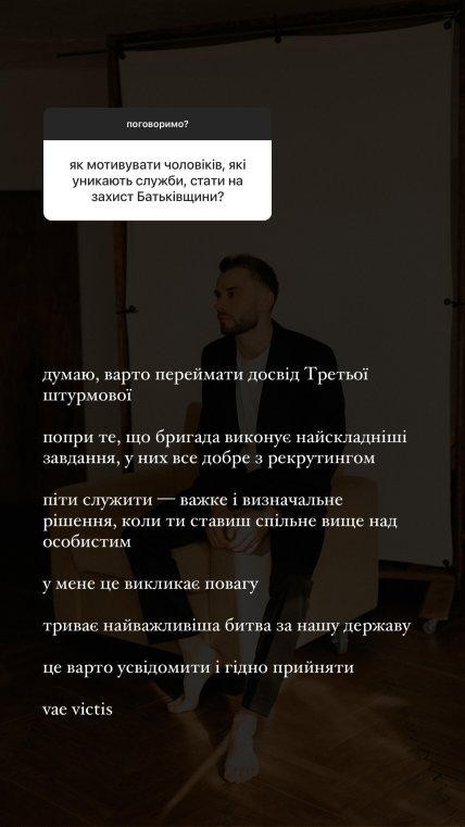 "Думаю, варто переймати досвід третьої штурмової. Попри те, що бригада виконує найскладніші завдання, у них усе добре з рекрутингом. Піти служити – складне й визначальне рішення. Коли ти ставиш спільне вище над особистим. У мене це викликає повагу. Триває найважливіша битва за нашу державу. Це варто усвідомити й гідно прийняти", – заявив телеведучий.