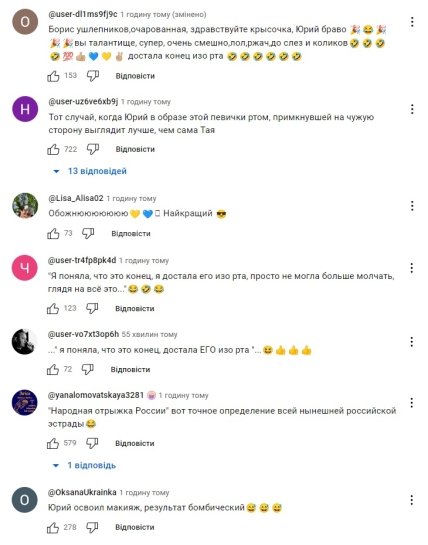 - Той випадок, коли Юрій в образі цієї співачки ротом, що припала на чужий бік, виглядає краще, ніж сама Тая.