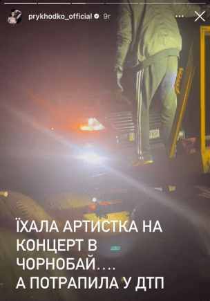 Українська співачка Анастасія Приходько, у якої нещодавно помер концертний менеджер, потрапила у дорожньо-транспортну пригоду в Черкаській області, де мала виступити із концертом в рамках туру "Холодно". Деталей про аварію невідомо, але артистка наголосила, що вагомою причиною неприємності є жахлива якість доріг.