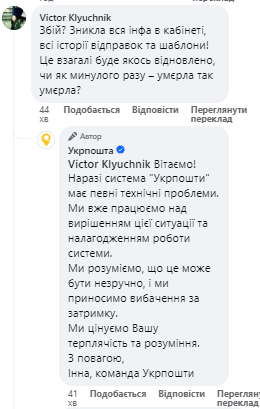 Тем временем в комментариях на официальной странице Укрпочты некоторые пожаловались, что в их личных кабинетах удалилась история получений и отправок. В свою очередь в компании отметили, что над разрешением этой ситуации проводится работа.