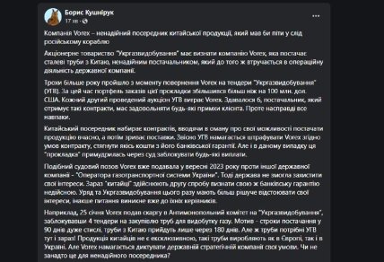 "25 января Vorex подал жалобу в Антимонопольный комитет на "Укргазвыдобування", заблокировав 4 тендера на закупку труб для добычи газа. Мотив — сроки поставки в 90 дней очень сжатые, трубы из Китая придут только через 180 дней. Но ведь трубы нужны УГВ здесь и сейчас!.. Такие трубы производят как в Европе, так и в Украине. Но Vorex пытается диктовать государственной стратегической компании свои условия", – отметил он.