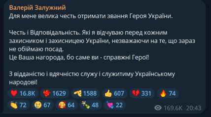 "Для меня большая честь получить звание Героя Украины. Честь и Ответственность. Какие я чувствую перед каждым защитником и защитницей Украины, несмотря на то, что сейчас не занимаю должностей. Это Ваша награда, потому что именно вы – настоящие Герои! С преданностью и благодарностью служу и буду служить Украинскому народу!", — говорится в сообщении Залужного.